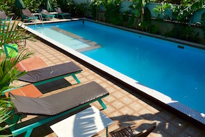 Guests can enjoy a relaxing swim in the hotel's pool, a refreshing welcome after a hot day of sightseeing. The morning sun warms the pool and illuminates the soft sun loungers, perfect for sunbathing. The pool area is shaded from mid- to late afternoon. Pool access is complimentary for hotel guests. Visitors can purchase a pool party ticket for a few dollars per person, which includes a shower, towel, swimming, a burger or sandwich, and a complimentary glass of beer, wine, or soft drink. If you don't have your own transportation, find one of the hotel's tuk-tuks near the port, and the roundtrip is free!